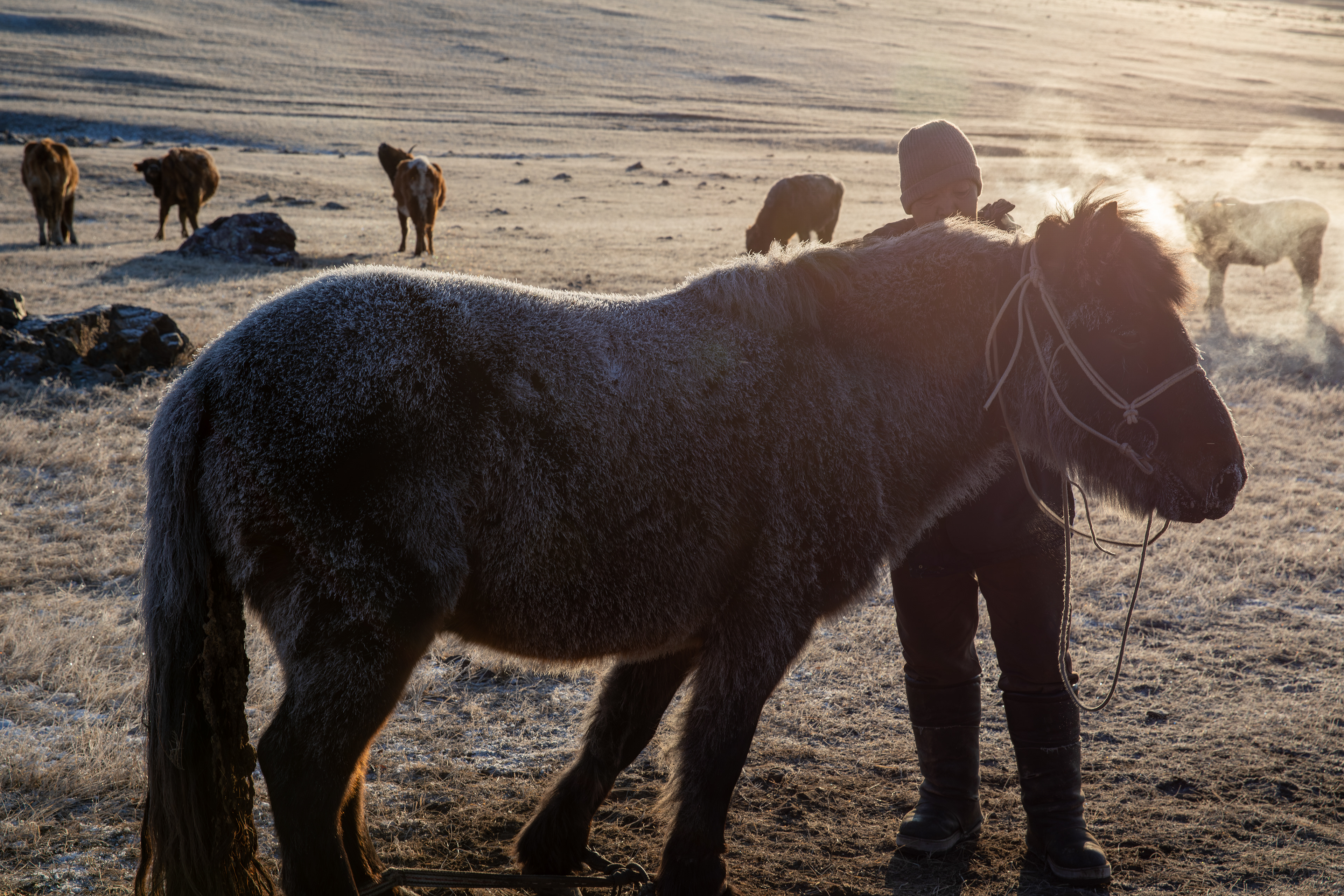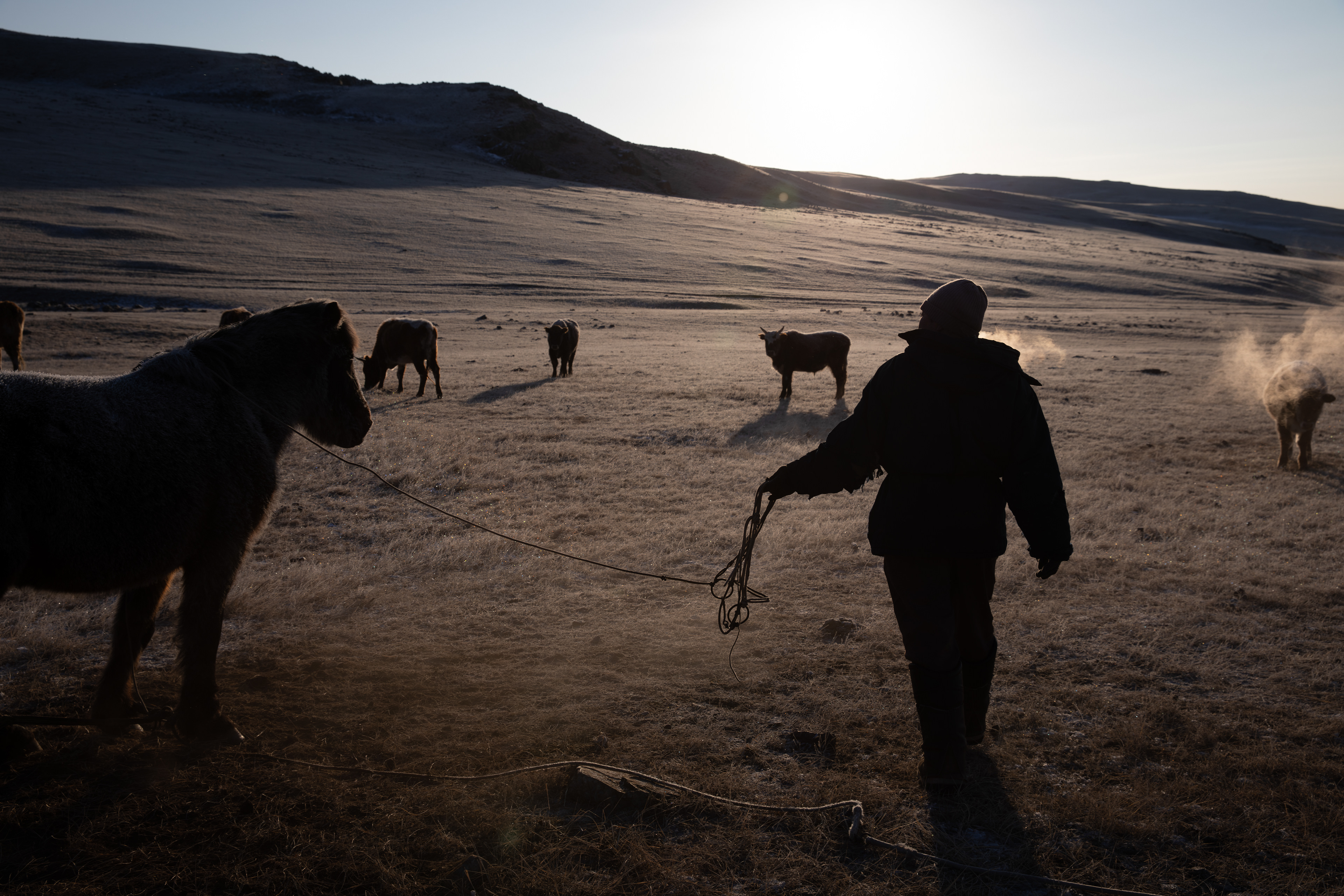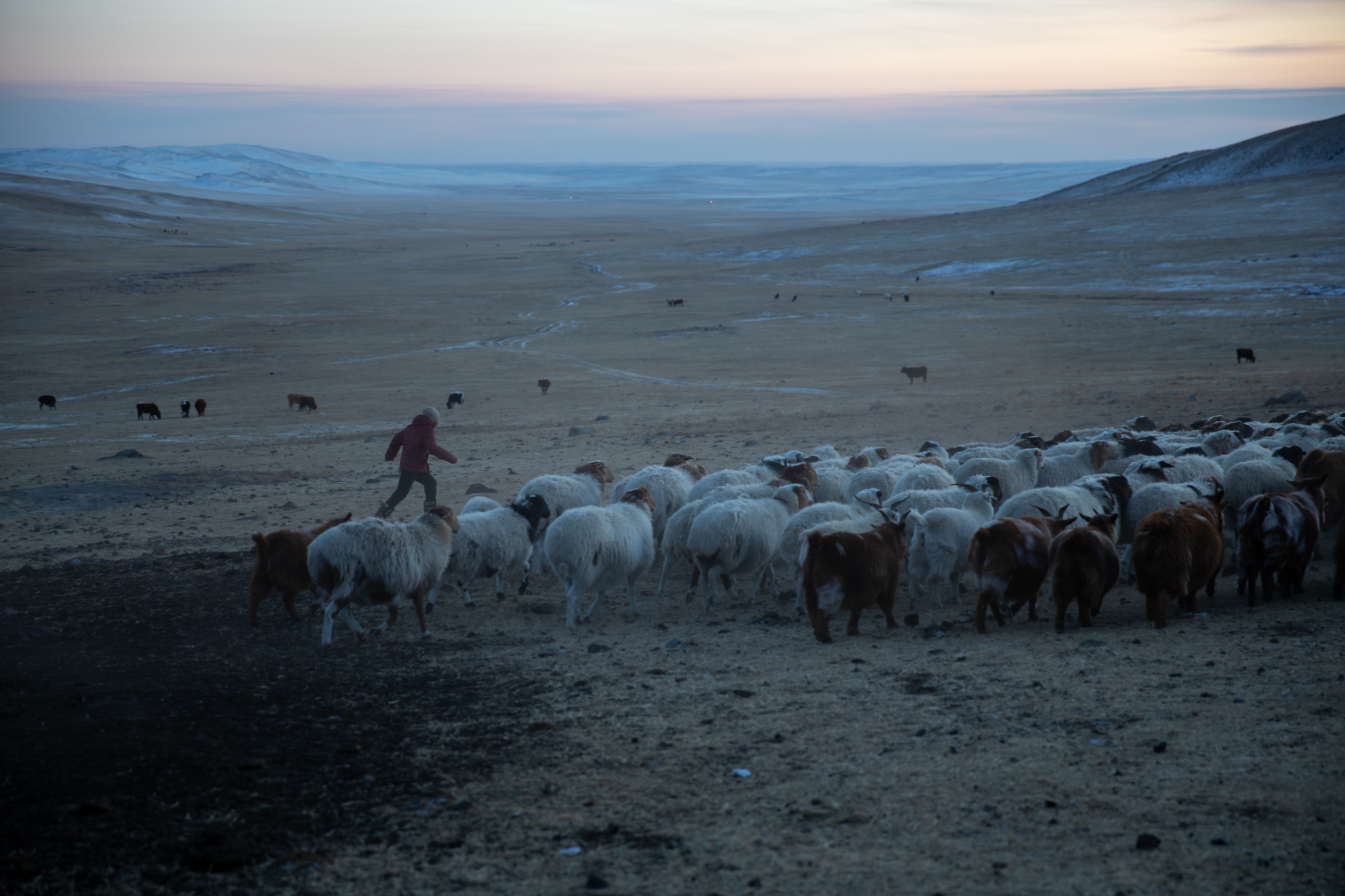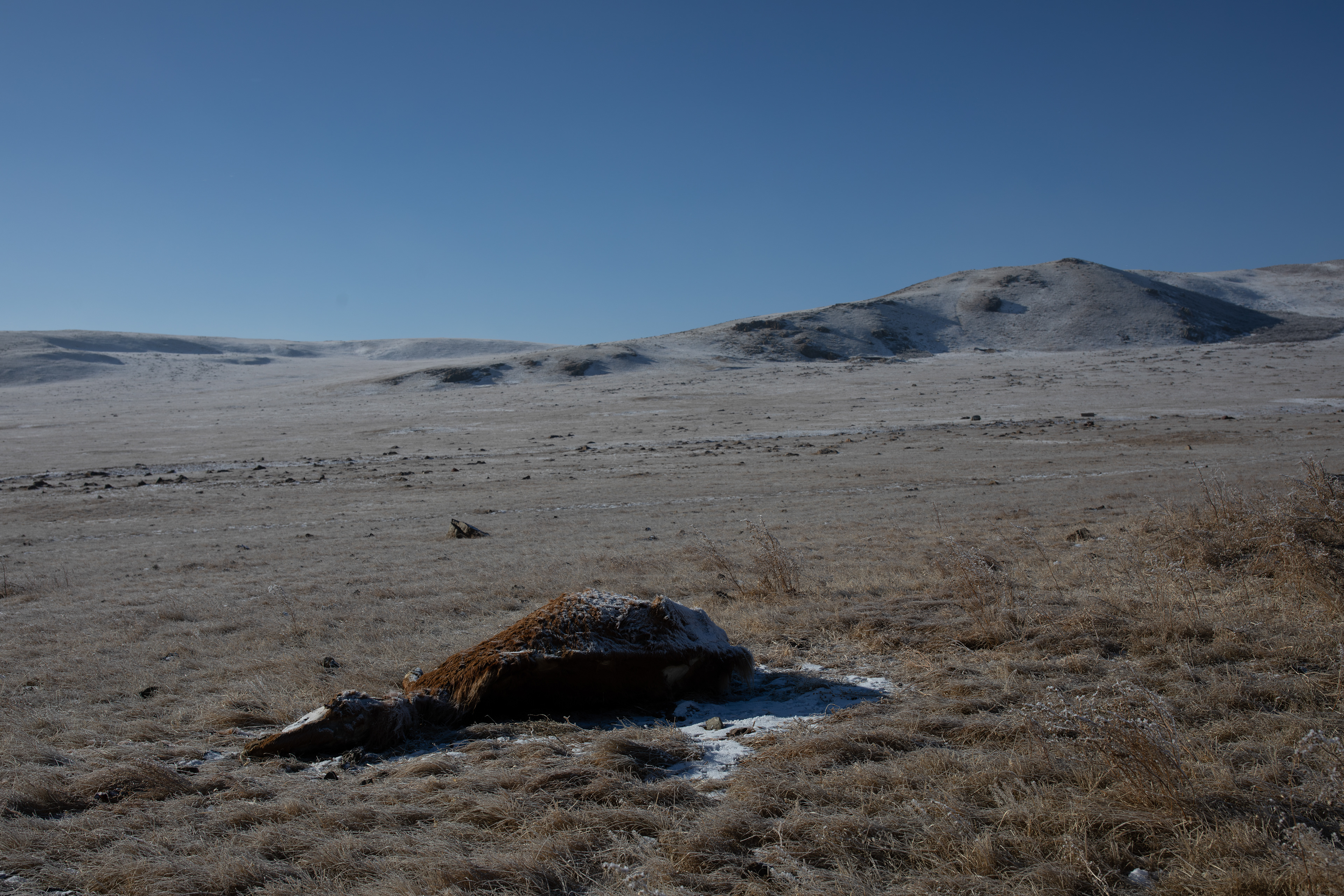 モンゴルの草原で、遊牧民の家族のもとに滞在した。気温は氷点下30度を下回る。休みはない。毎日、家畜を移動させ、凍った地面を越えて水を運び、冬に備えて屠畜を行う。ゲルの中では、家族が伝統的な骨の遊びやトランプに興じる一方で、息子たちはスマートフォンを操っていた。彼らはウランバートルの大学で建築を学んでおり、遊牧を継ぐつもりはないという。労働は途切れず、環境は厳しく、遊牧を営む家族の数は減り続けている。この写真が記録しているのは、存続するかどうかわからない暮らし——休みなく土地に向き合い続けることで成り立つ、共存の一つの形である。