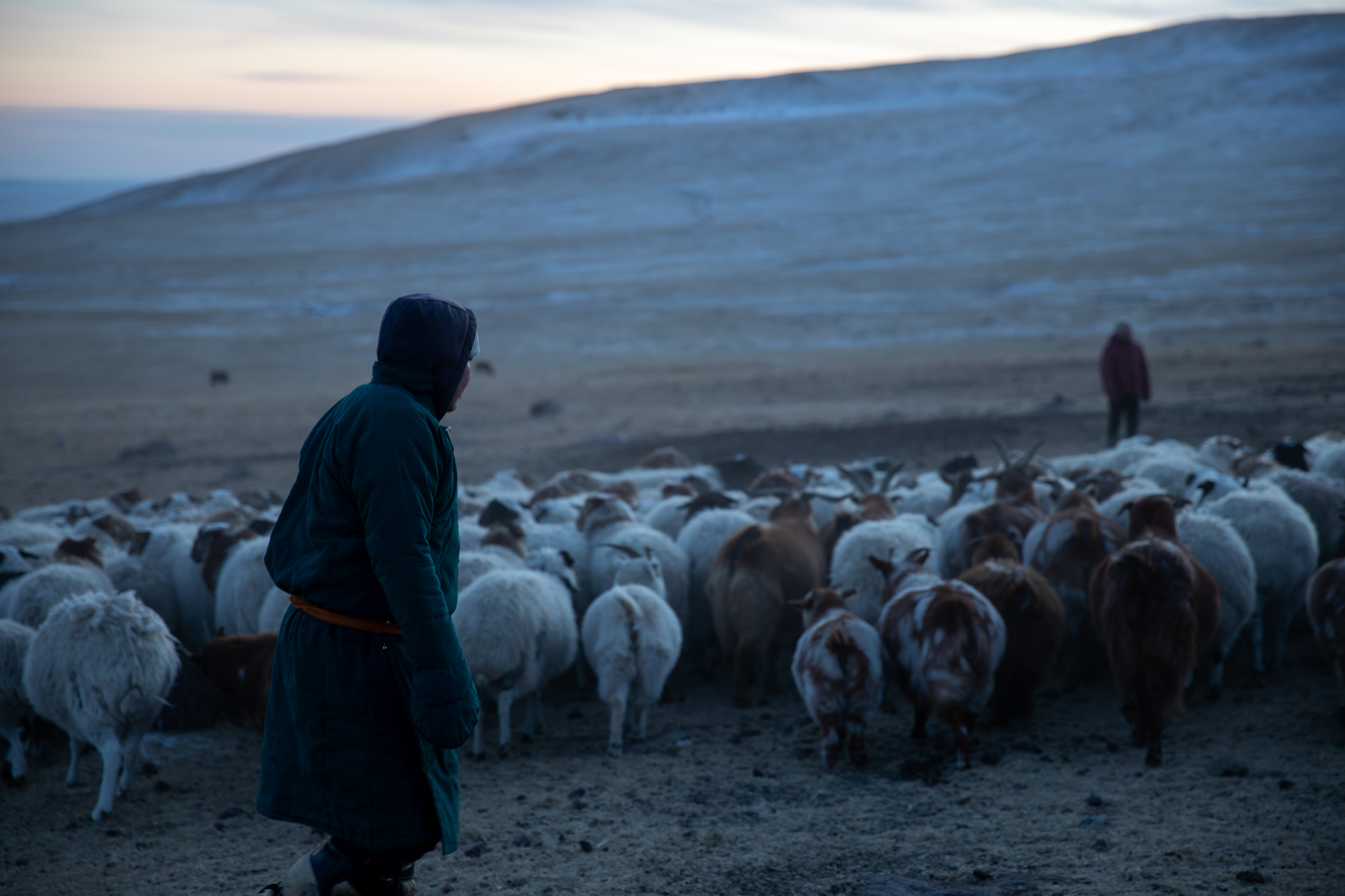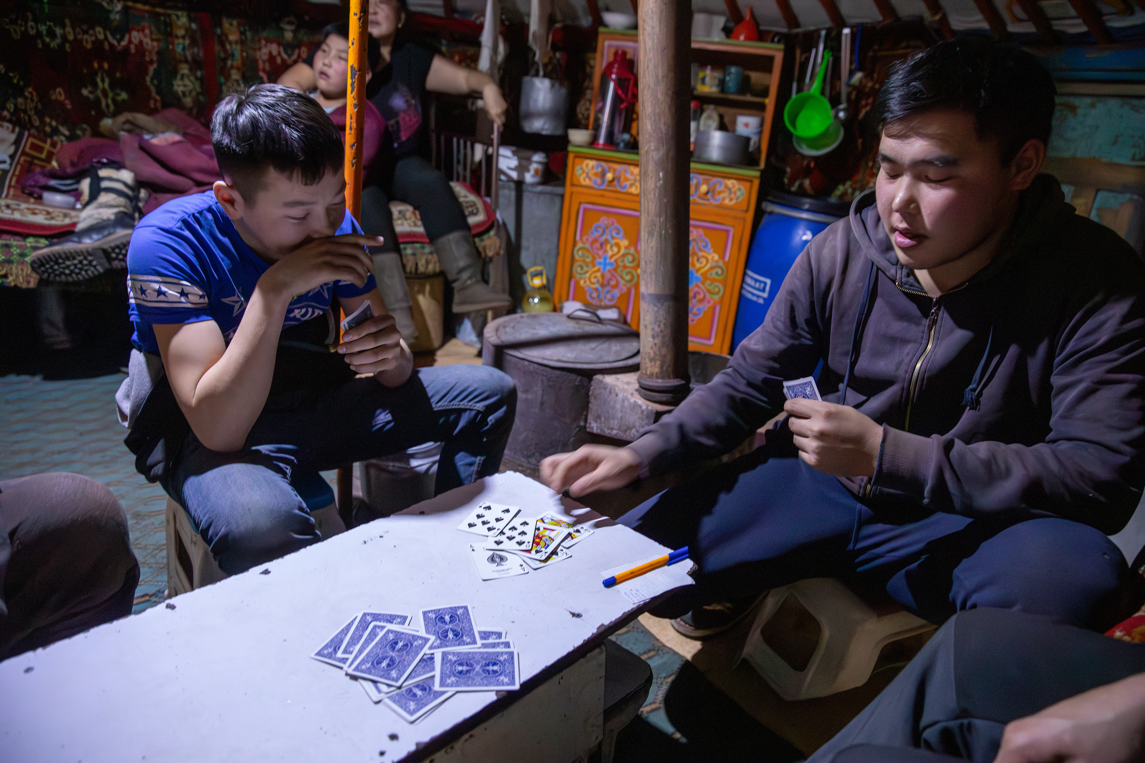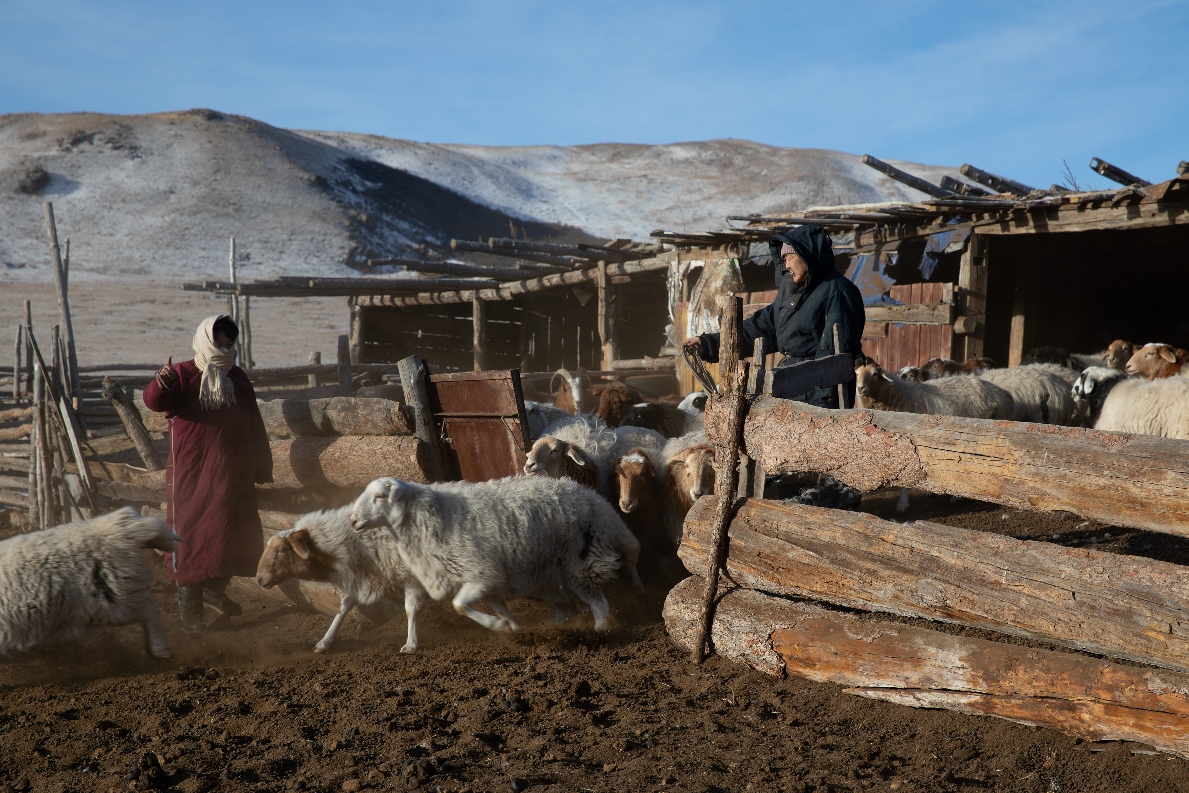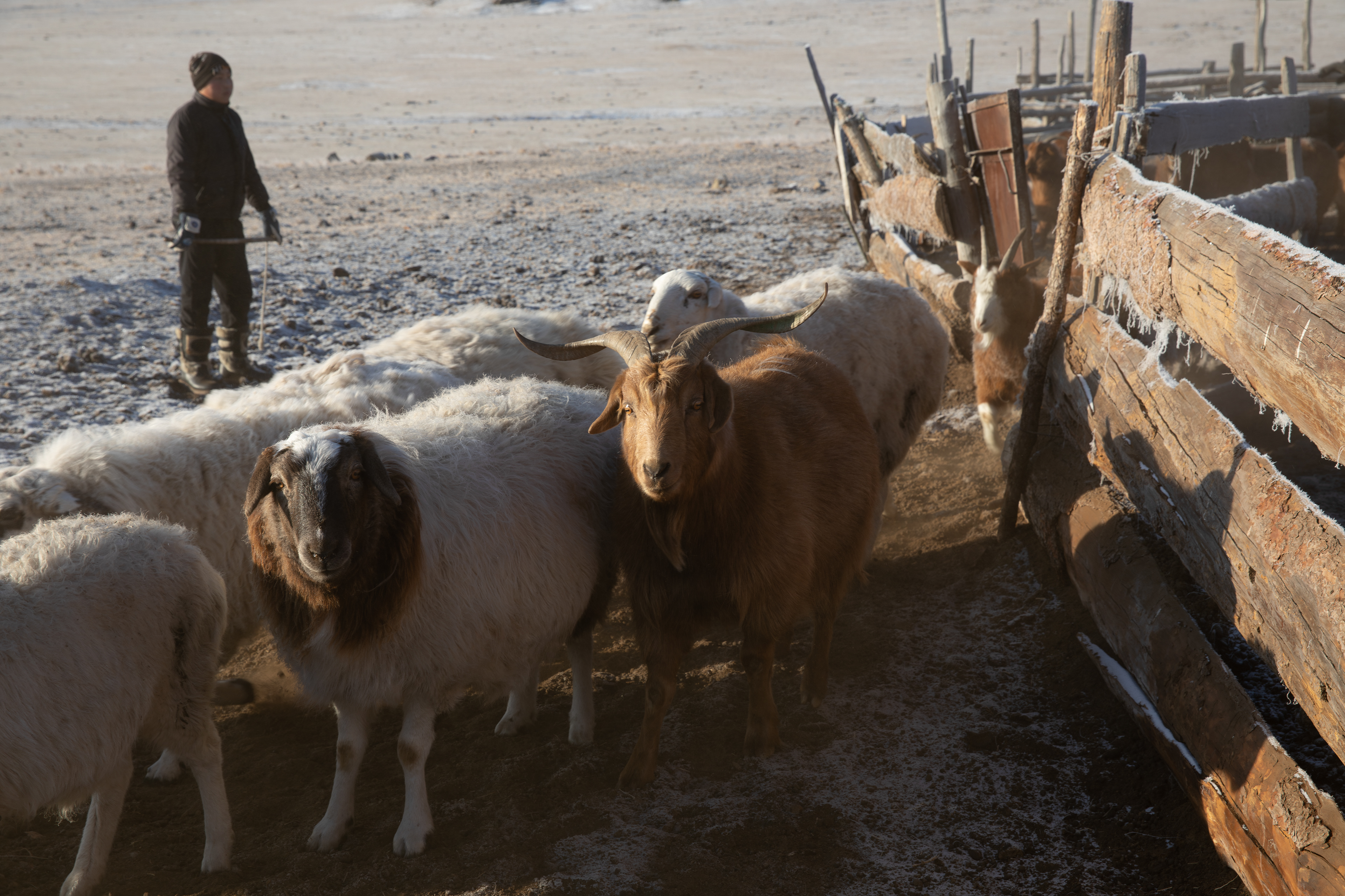 モンゴルの草原で、遊牧民の家族のもとに滞在した。気温は氷点下30度を下回る。休みはない。毎日、家畜を移動させ、凍った地面を越えて水を運び、冬に備えて屠畜を行う。ゲルの中では、家族が伝統的な骨の遊びやトランプに興じる一方で、息子たちはスマートフォンを操っていた。彼らはウランバートルの大学で建築を学んでおり、遊牧を継ぐつもりはないという。労働は途切れず、環境は厳しく、遊牧を営む家族の数は減り続けている。この写真が記録しているのは、存続するかどうかわからない暮らし——休みなく土地に向き合い続けることで成り立つ、共存の一つの形である。