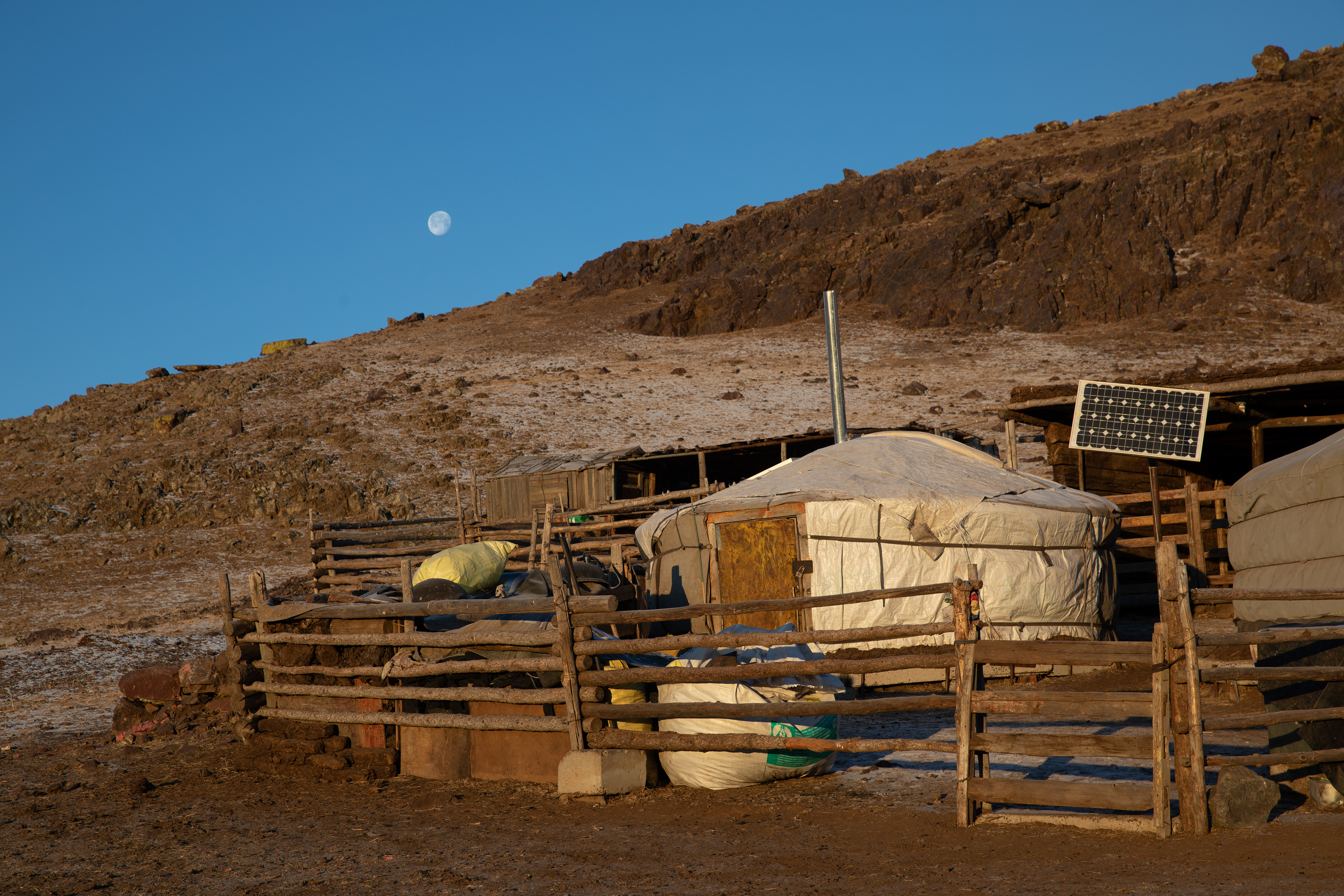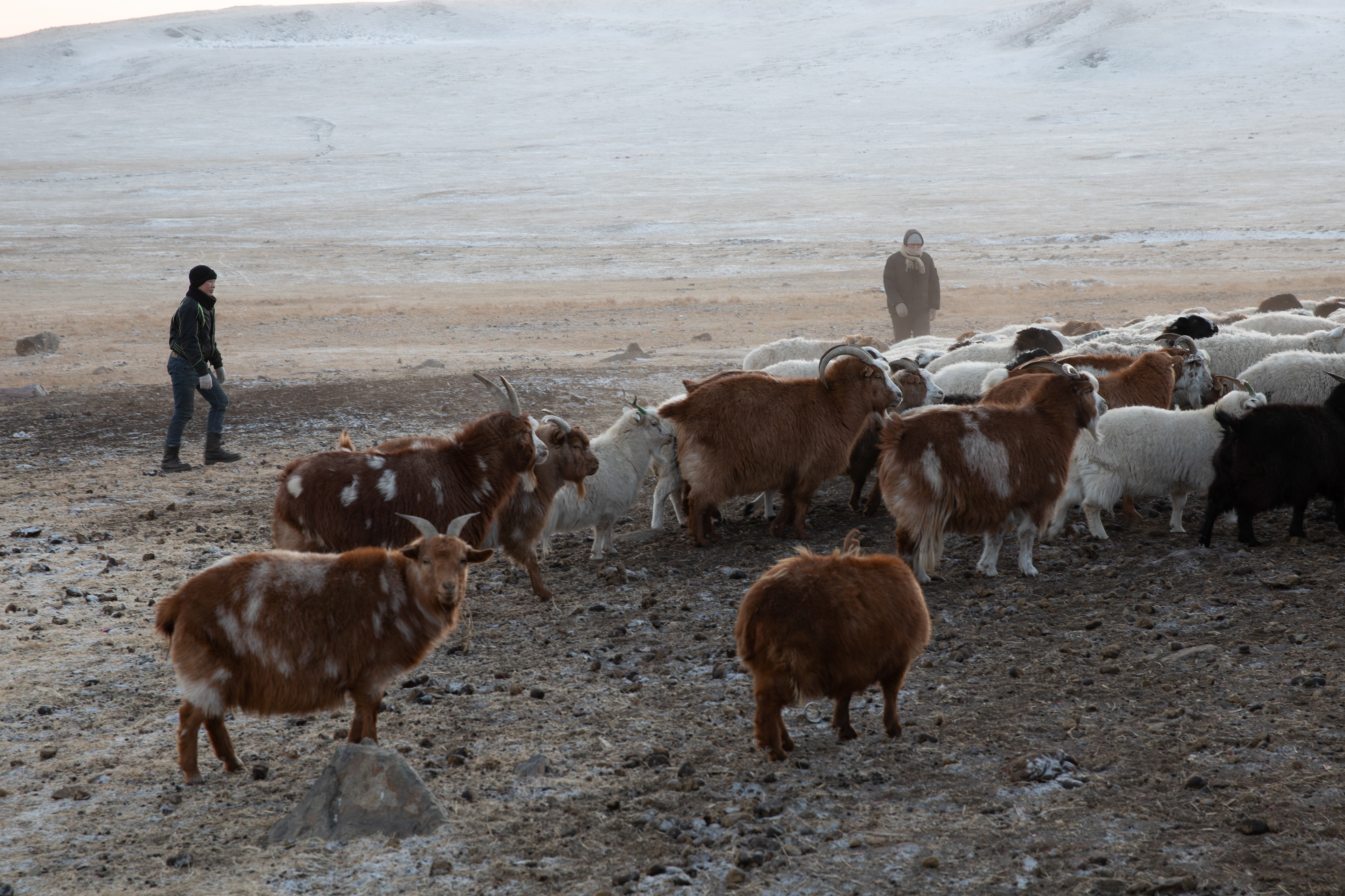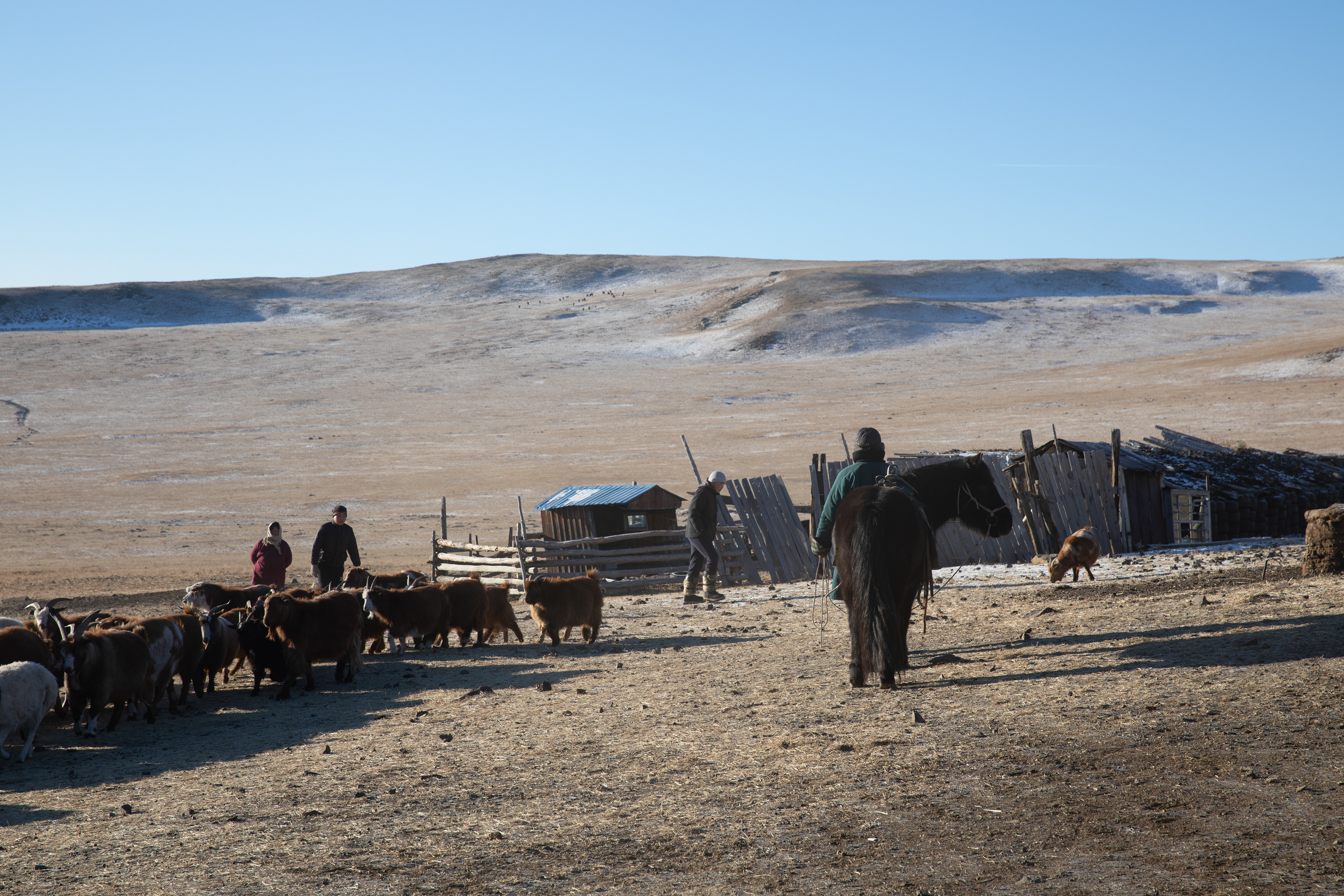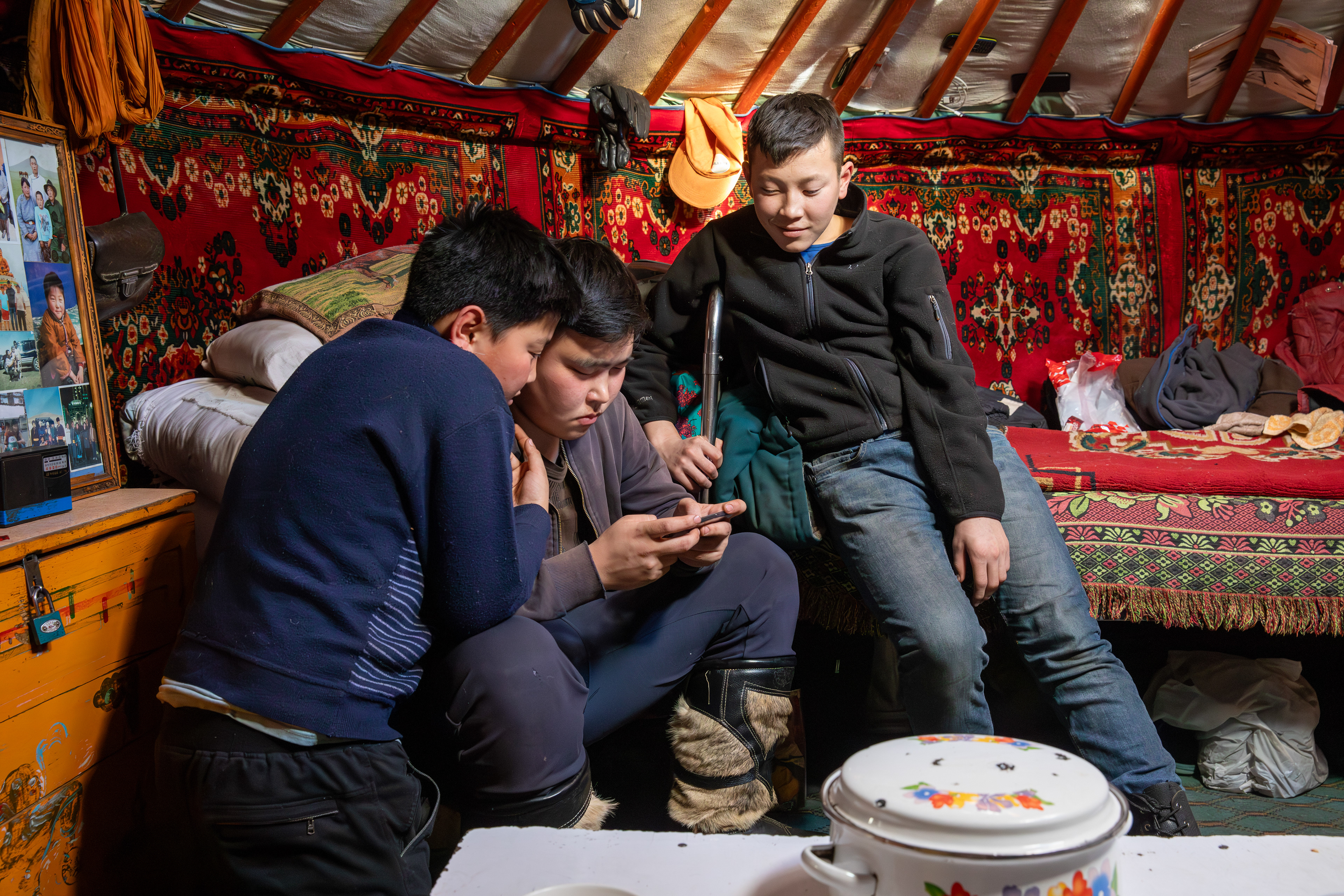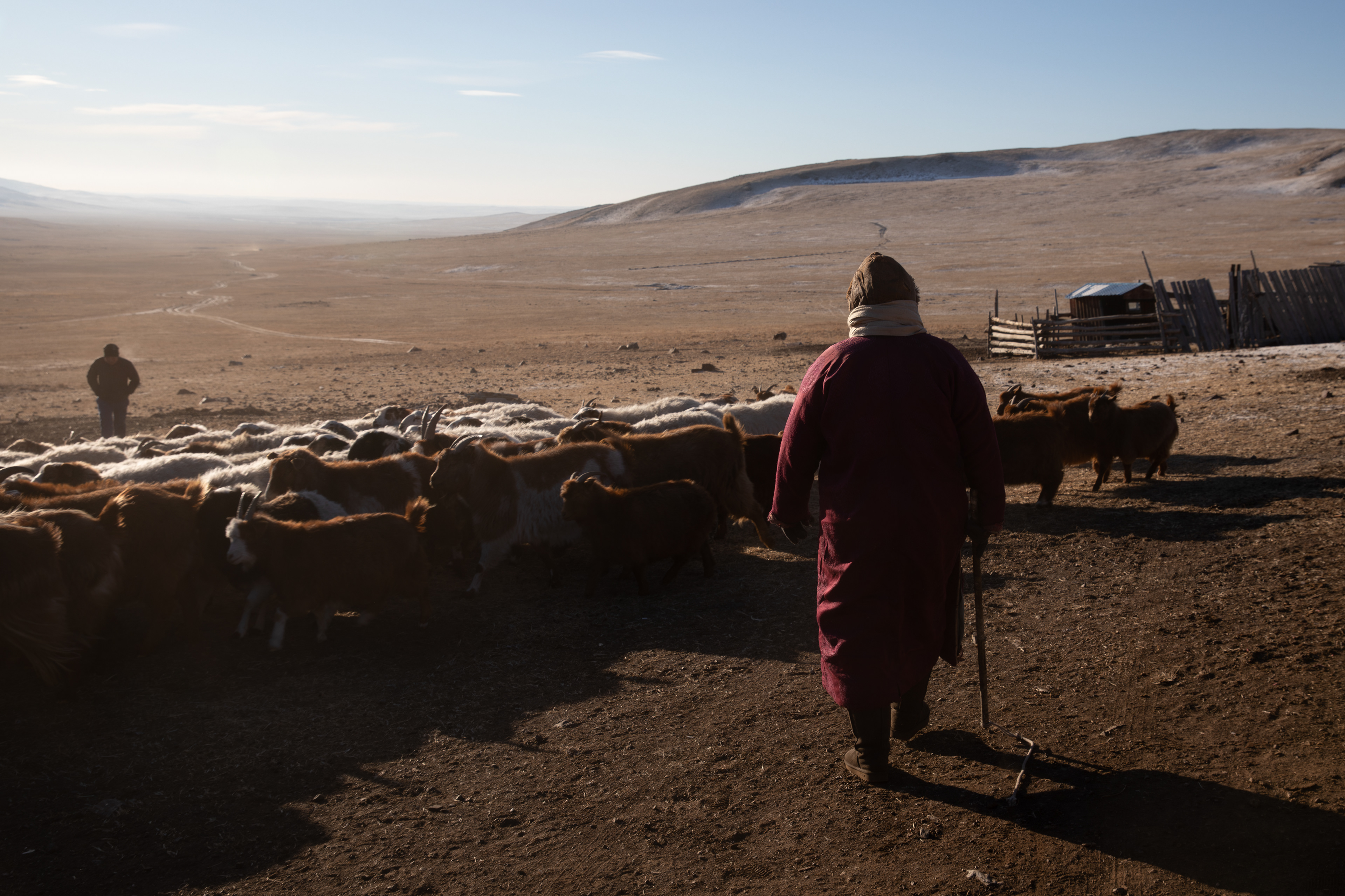 モンゴルの草原で、遊牧民の家族のもとに滞在した。気温は氷点下30度を下回る。休みはない。毎日、家畜を移動させ、凍った地面を越えて水を運び、冬に備えて屠畜を行う。ゲルの中では、家族が伝統的な骨の遊びやトランプに興じる一方で、息子たちはスマートフォンを操っていた。彼らはウランバートルの大学で建築を学んでおり、遊牧を継ぐつもりはないという。労働は途切れず、環境は厳しく、遊牧を営む家族の数は減り続けている。この写真が記録しているのは、存続するかどうかわからない暮らし——休みなく土地に向き合い続けることで成り立つ、共存の一つの形である。